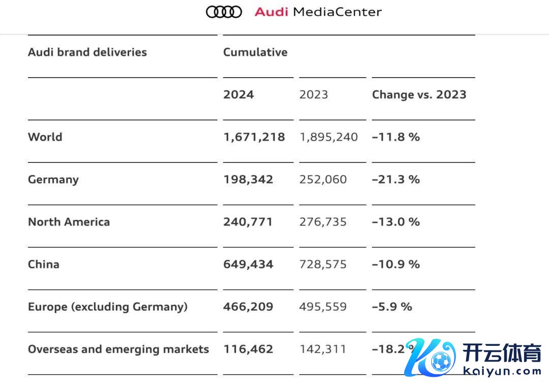 2024年,奥迪宇宙销量达167.12万辆,同比下滑11.8% 。其中北好意思、德国、中国等主要市集纷繁出现下滑。