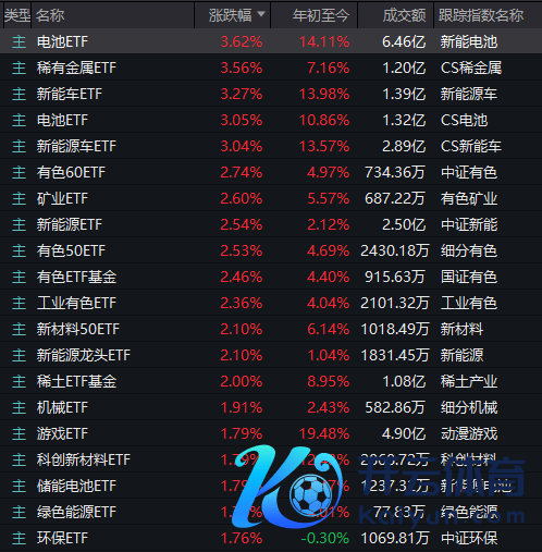落幕收盘,场内ETF涨幅前20名的基金,半数以上与电板产业关联,如电板ETF、至极金属ETF、新能车ETF等收盘均涨超3%。